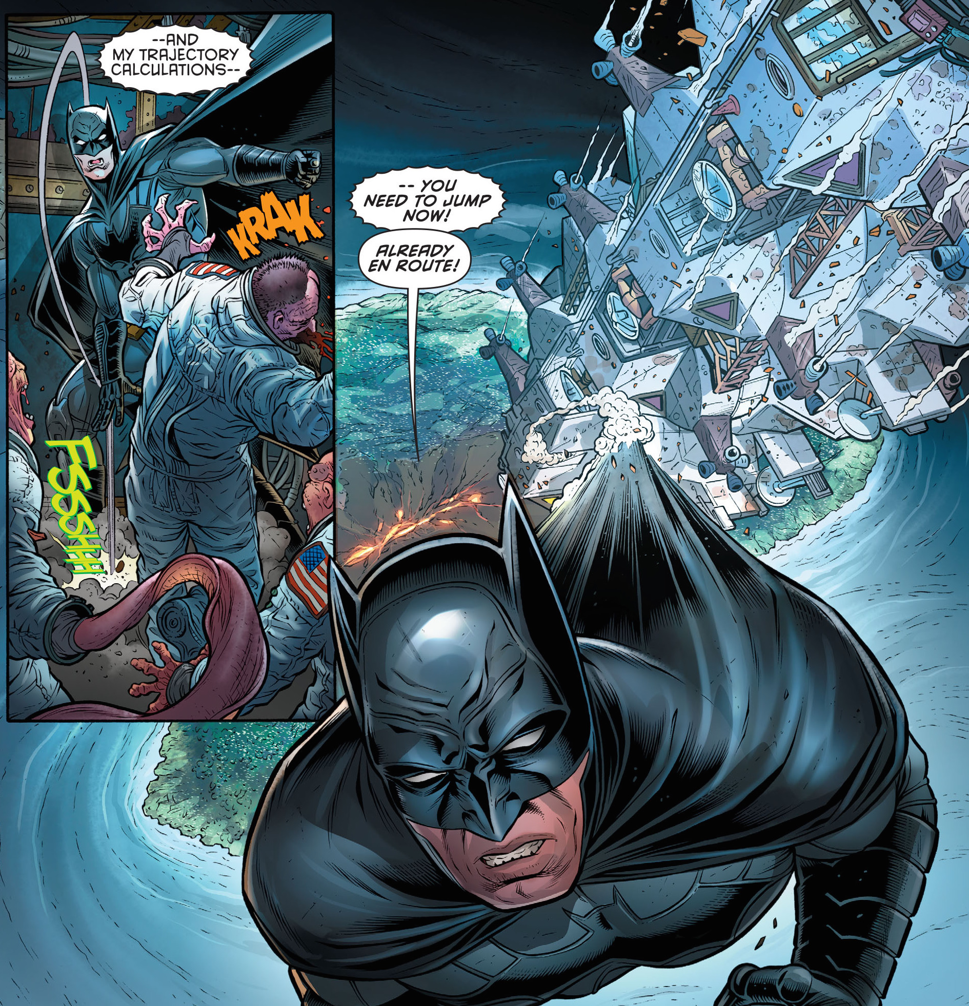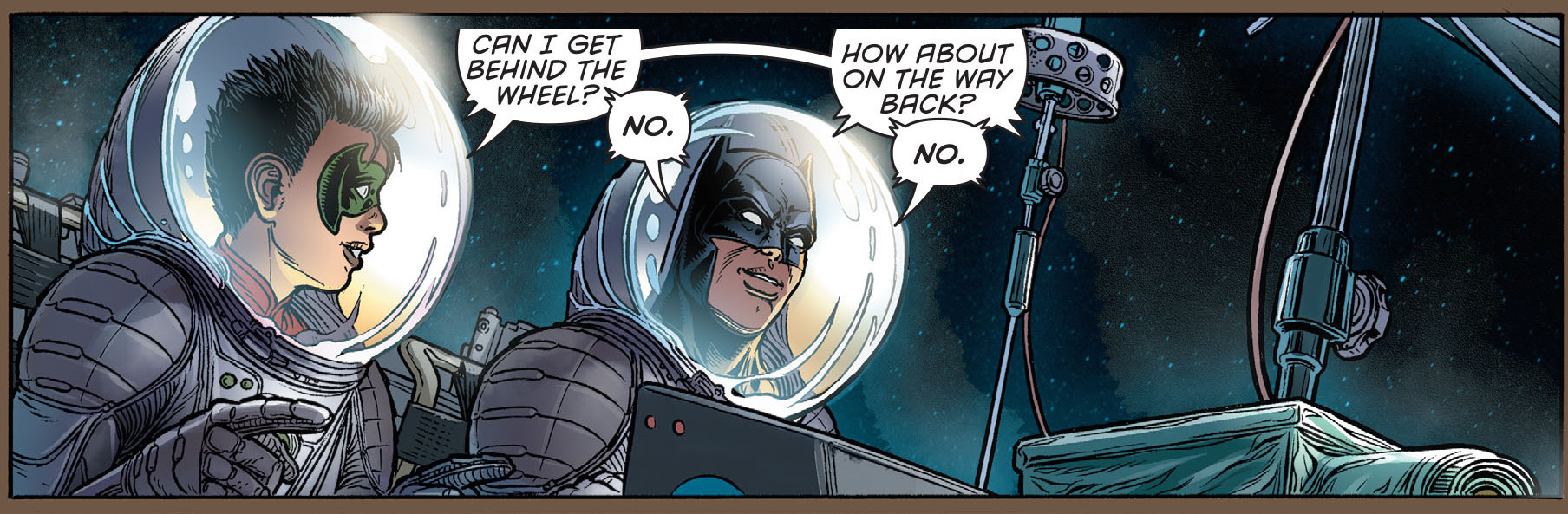 I guess since this is a “by-the-numbers” plot I shouldn’t be surprised by some of the clichés and tropes present. I’m tired of self-sacrifice you guys; can’t we just work as a team and not try to ride the doomed rocket to its demise? Another thing: why is it in space movies that the heroes take off their space suits/helmets when they’re in the craft?? Batman doesn’t know what those aliens have done to that ship, and after all, “Failing to prepare is preparing to fail.” B y the way, how far above Earth were they when Batman ejected? Another thing that can be forgivable in movies but maybe not so much in comics is the presence of sound in space. After the first KRRRRROOOOOOMM that the moon rover made, I couldn’t help but notice all of the sounds inserted that felt very out of place.
