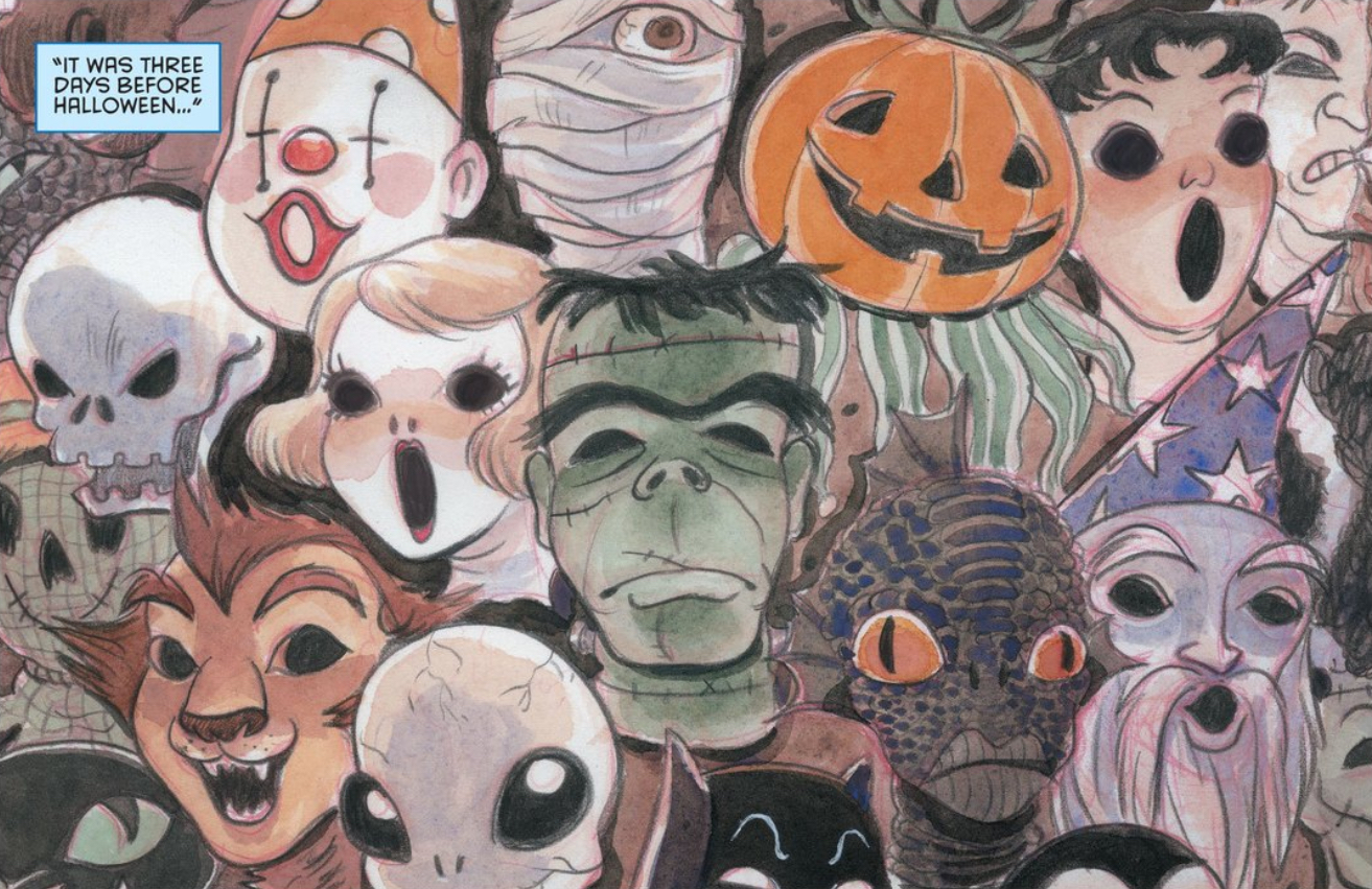 Actually, masks are a bit of a runner throughout the issue, which makes sense for a series so much about the secrets (and non-secrets) of teen identity. Here again, the framing device adds meaning to that theme, as it reveals the characters’ own interest in identity, and the repercussions of wearing masks.