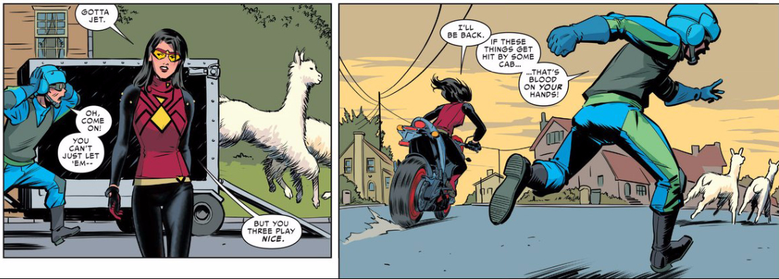 Spencer: There’s always been a weird contradiction at the heart of Jessica Drew — raised as a spy, she’s a top-notch strategist and infiltrator, but since she was also raised in isolation, she’s socially awkward and often a bit naive. These seemingly conflicting traits could easily trip up a writer, leading to a situation where Jess is either too “normal” or too naive. The latter’s a trap Dennis Hopeless nearly falls prey to in Spider-Woman 6 (when Jess almost blunders into an obvious trap), but fortunately, Hopeless easily makes up for this not only via Jess’s natural charm and humor, but by showing how Jessica’s temper and stubborn streak often get the better of her. It’s very human, and Spider-Woman‘s vastly relatable central character and intriguing mystery alone make it a title worth reading — still, Javier Rodriguez’s art and colors have a lot to do with what makes this book so fun. As always, I love his intuitive layouts and energetic action scenes, but this month I think my favorite touches are the silly designs and humorous touches Rodriguez throws in.