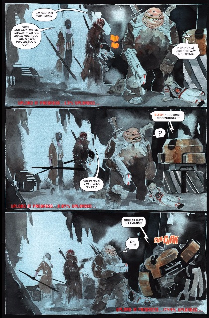 Spencer: What does it mean to be alive? Early in Descender 2, Tim-21’s creator, Dr. Jin Quon, tells the tiny robot that he’s not alive, but the rest of the issue seems to argue otherwise. Flashbacks of Tim’s life depict his transformation from a Tabula Rasa to a being that genuinely loves his human family and has been accepted as one of them, and if love doesn’t equal life, then what does? These flashbacks also makes the present-day sequence, where Tim’s pursued by bounty hunters, all the more tragic. While Jeff Lemire and Dustin Nguyen don’t hesitate to remind us of Tim-21’s robotic nature and the power inherent in it (he actually kills two of his attackers), we’re still seeing what amounts to a child chased by monstrous, murderous creatures. How could anyone not feel for him? I can’t help but to see this issue as a cry for compassion, empathy, and understanding; it’s easy to persecute “others” (like how Descender‘s populous has essentially instigated a robotic genocide) when they’re simply a faceless threat, but getting to know them as individuals with their own feelings and personalities can turn that dynamic on its head.
