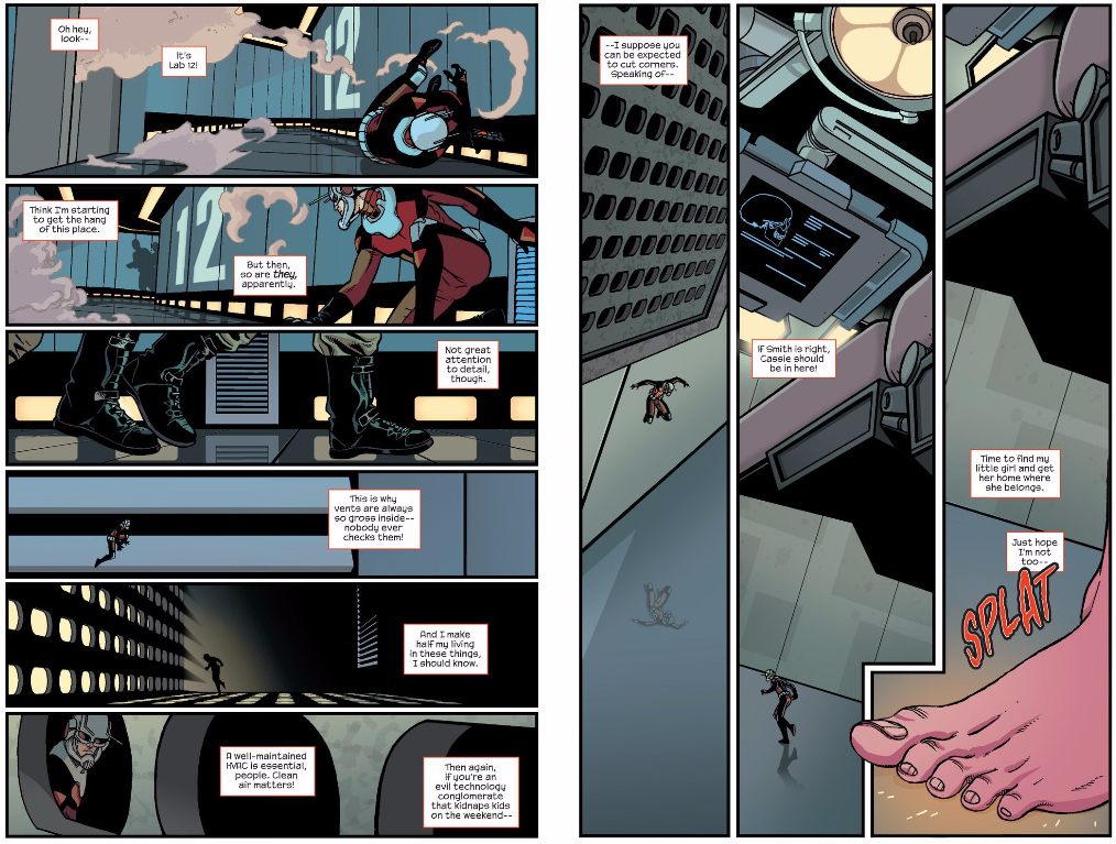As I’ve come to expect from this title, Scott’s monologue is a hilarious look into the trials of traveling through air vents (which shows an insightful understanding of Ant-Man’s skill set on Spencer’s part), but Scott’s almost chipper attitude and the silly gag that ends the second page both feel out of place when you take into consideration that the cliffhanger on the next page involves Cassie’s heart being transplanted against her will. In many ways this is a very funny issue, but I think this is the point where the jokes start to feel inappropriate to me.