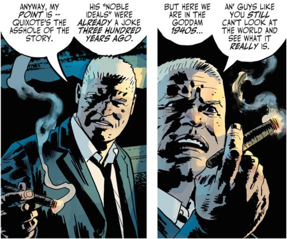 The film crew is up in Ojai to shoot some exteriors, which brings some uncomfortable points of comparisons for the last time they were in Ojai — to shoot these same scenes the first time with Valeria. That these reshoots are a pale reflection of the originals becomes an important theme for the issue, from Gil’s tirade about studios regurgitating the same “dumb bullshit,” to Brodsky’s lecture on acting like Don Quixote. Those are both great moments, so I want to pause to dig into those a bit.