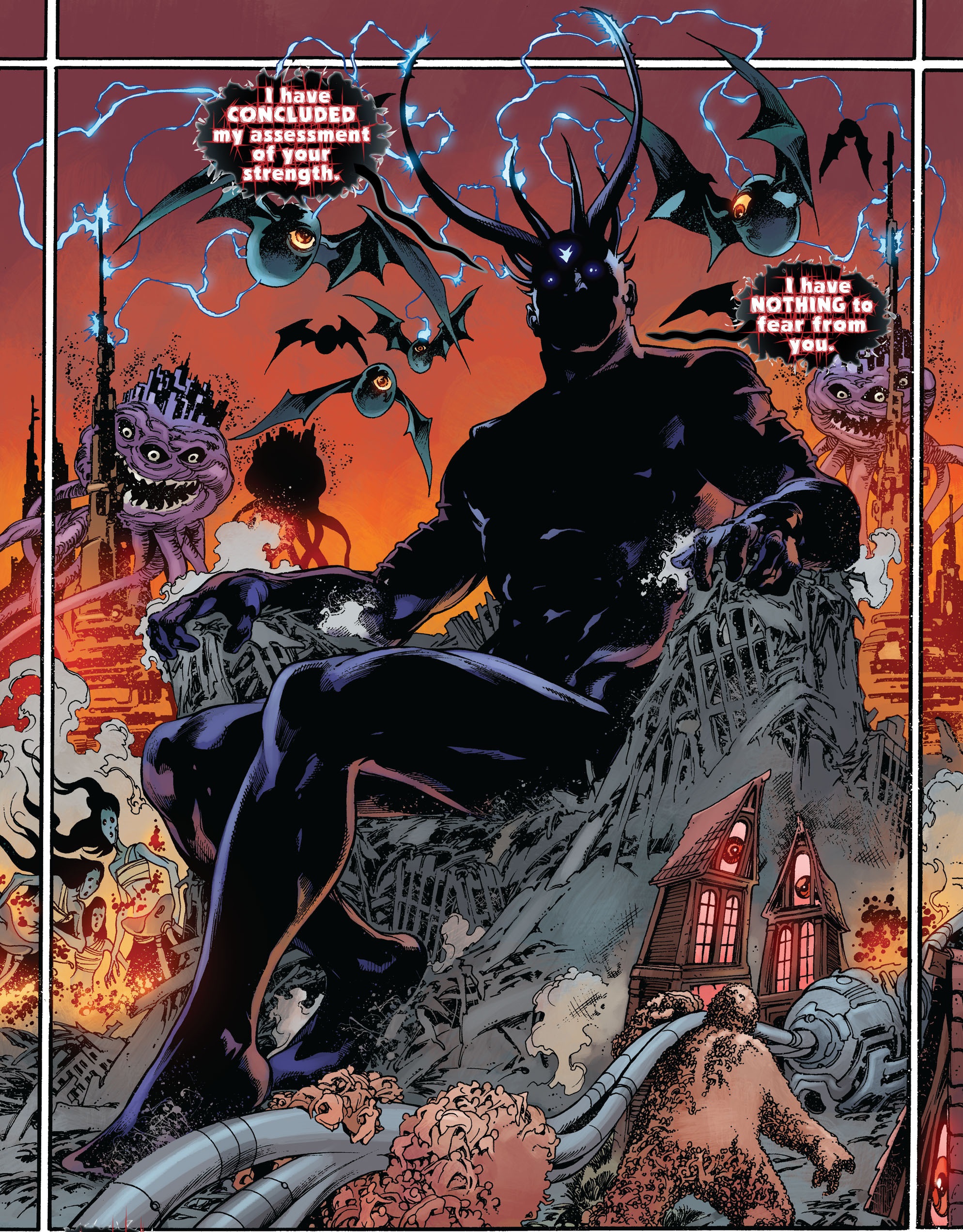 Vilifying new fans for wanting something different is kind of icky, but Morrison’s ire isn’t directed only at new readers — there’s something bigger pulling their strings on Earth-7. The giant being who has wiped out entire multiverses isn’t named, but his purpose as an editorial analogue is clear: he has the power to destroy this multiverse whenever he sees fit, and there’s nothing anyone can do about it.