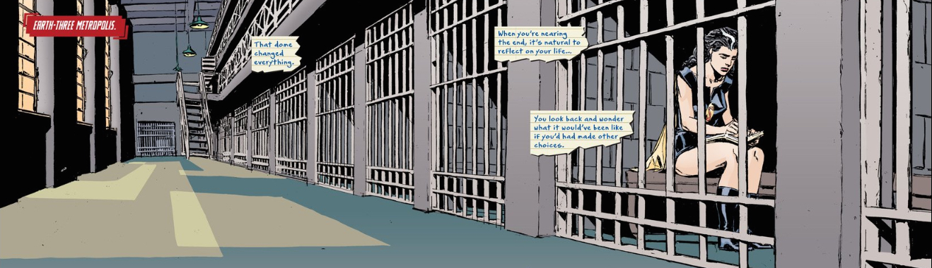 On Earth 3, the depowered Crime Syndicate mounts an assault on to rescue Superwoman (Lois Lane) from death row. Their liberation attempt is stopped by Flash Rogue counterparts The Rogue Hunters. The Syndicate is arrested, failing to save Superwoman from her execution. On the Earth of “DC One Million” Justice Legion Alpha has also lost one of their members, Owlwoman, to their enemies the Luthorians. The Legion is on the run from the Luthorians, who eventually find and attack them once again. After both teams on both Earths lose more members, Telos makes his speech and drops the dome. Characters like Owlman and Superman decide that they don’t want to play Telos’ game, while Ultraman is more than happy to take on Justice Legion Alpha.