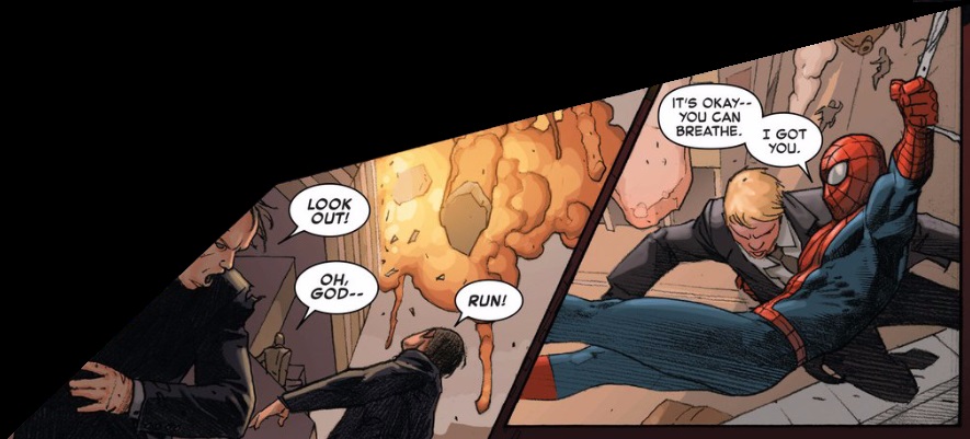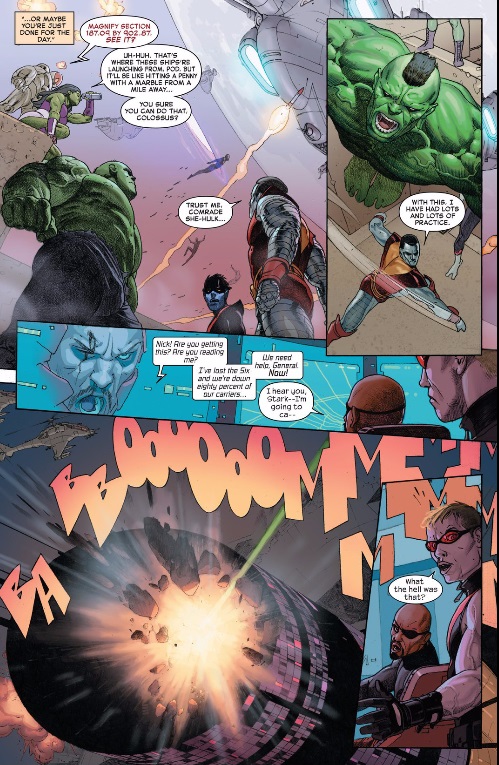Just like the Hulk/Colossus Fastball Special Ryan showcased, this page doesn’t waste time with images that don’t immediately scream HERO. Check out Luke Cage and Iron Fist rescuing a kid from the rubble, or the Guardians arriving on the scene or Thor and Storm teaming up to take on a Trikelion helicarrier. The panels leading in to this page show Spider-Man swooping in to save a civvy from some falling debris for crying out loud!
