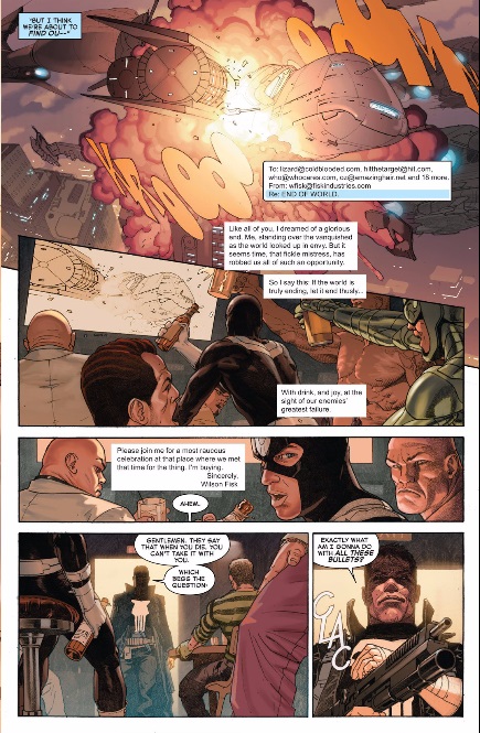 I feel like there’s another metaphor here about the limited power of optimism. It’s interesting to me that every single thing these heroes resort to is totally within their wheelhouse, simply on a grander (and in some cases, more brazen) scale. That amazing scene that Ryan shared of Punisher spending is last minutes on Earth mowing dudes down in a dive bar is so quintessentially in-character for Frank that it falls into the category of “business as usual.” The lesson is that “business as usual” fails. That’s an absolutely vital lesson, and one that the stewards of any work of art that’s been in existence for as long as the Marvel Universe has should be forced to engage in from time to time.