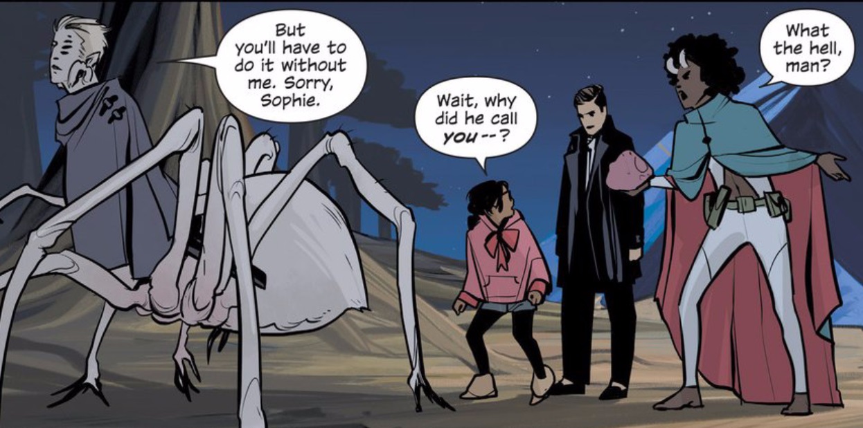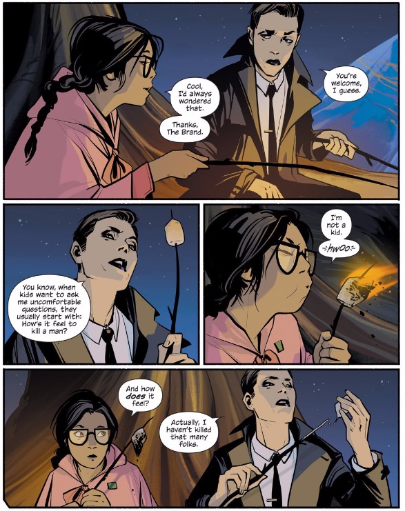 The Brand, while not exactly forthcoming with details, is open to discussing some pretty severe truths of the universe with her young companion. Part of that may have to do with Sophie insisting that she’s “not a kid,” even if that sloppily toasted marshmallow tells a different story. Even if The Brand isn’t keeping the horrors of war from Sophie (and at this stage of the game, really, how could she?), there are emotionally realities she’s keeping carefully guarded. It’s actually my favorite moment in the issue: right after Halvor gives them the location of some male dragons, he casually uses The Brand’s real name.