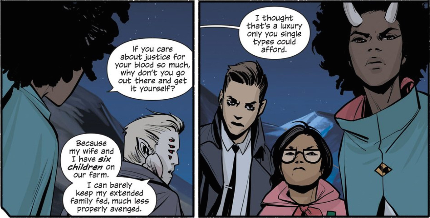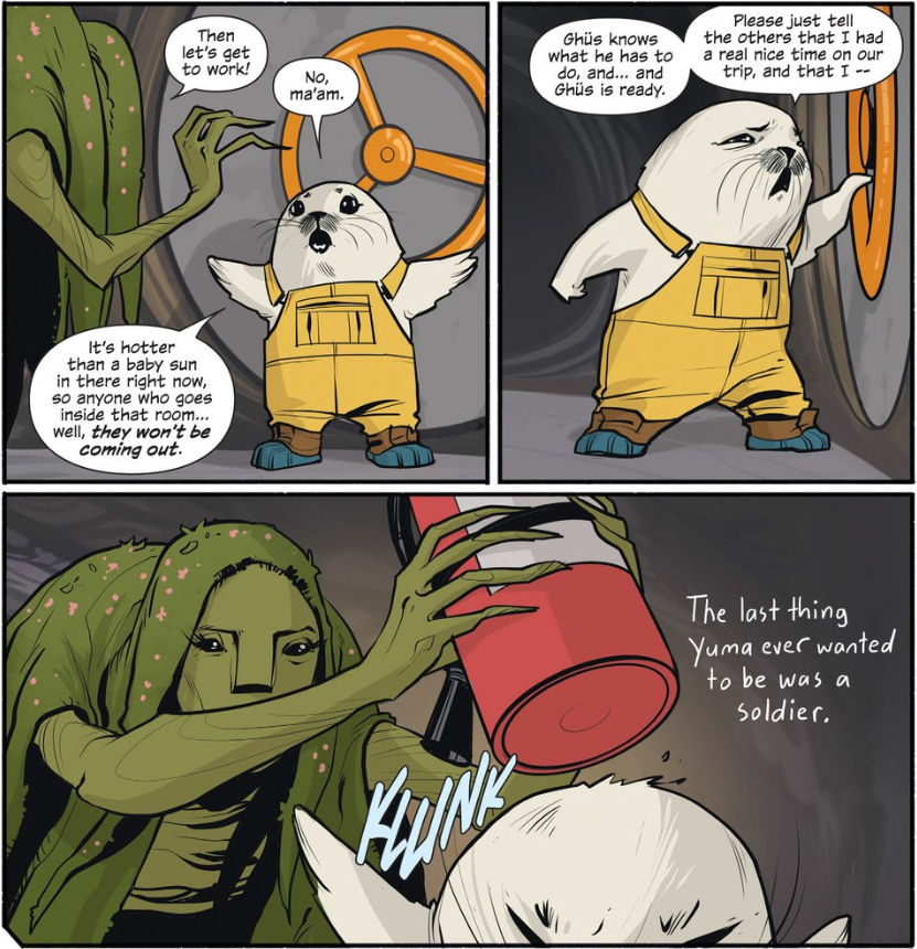 The most unlikely of families, though, is that of Marko, Prince Robot IV, Ghüs, and Yuma, who find themselves suddenly under fire from the Robot Kingdom. Their interests here align logically — they all want to survive — but Vaughan throws an unlikely wrinkle when somebody needs to sacrifice themselves to repair the engine. Marko and Prince Robot are out — they stay on the bridge because they both have combat experience, but maybe also because, like Halvor, they have kids to think about — which leaves it to Ghüs and Yuma. Ghüs is ready to make the ultimate sacrifice (because Vaughan and Staples can’t go an issue without Ghüs melting our collective heart), but Yuma, still feeling guilty over Marko’s bad trip, knocks him out to do it herself.
