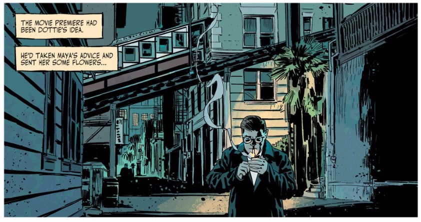 I’ve always been intrigued at the third-person narration writer Ed Brubaker employs for this series. In our discussion of the first issue, Ryan mentioned that third-person narration was “actually quite common with a specific type of noir popularized in the 1940s: the semidocumentary.” That sub-genre is a hybrid of sorts between noir and historical fiction, where real-world events and characters are woven into a fictional story. In many ways, that’s exactly what The Fade Out is: real-life figures like Desi Arnaz and Dashiell Hammett rub elbows with fictional characters (many of whom are based on one or more real-life figures, as well).