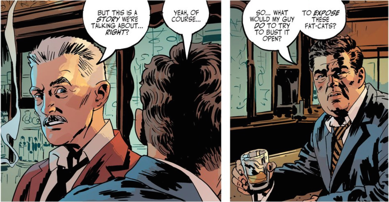 This is by no means the first time artist Sean Phillips has projected Charlie’s thoughts on the scene he’s in — that was a key moment in issue 4 — but this is the first time it’s been so explicitly tied to physical media. I’m referring, of course, to the halfdot pattern in the second panel, which suggests that the image is coming from a newspaper or magazine and not from inside Charlie’s head. It’s as though someone is reflecting back on this moment after the fact, perhaps using this photograph as real-world evidence of the story they’re telling