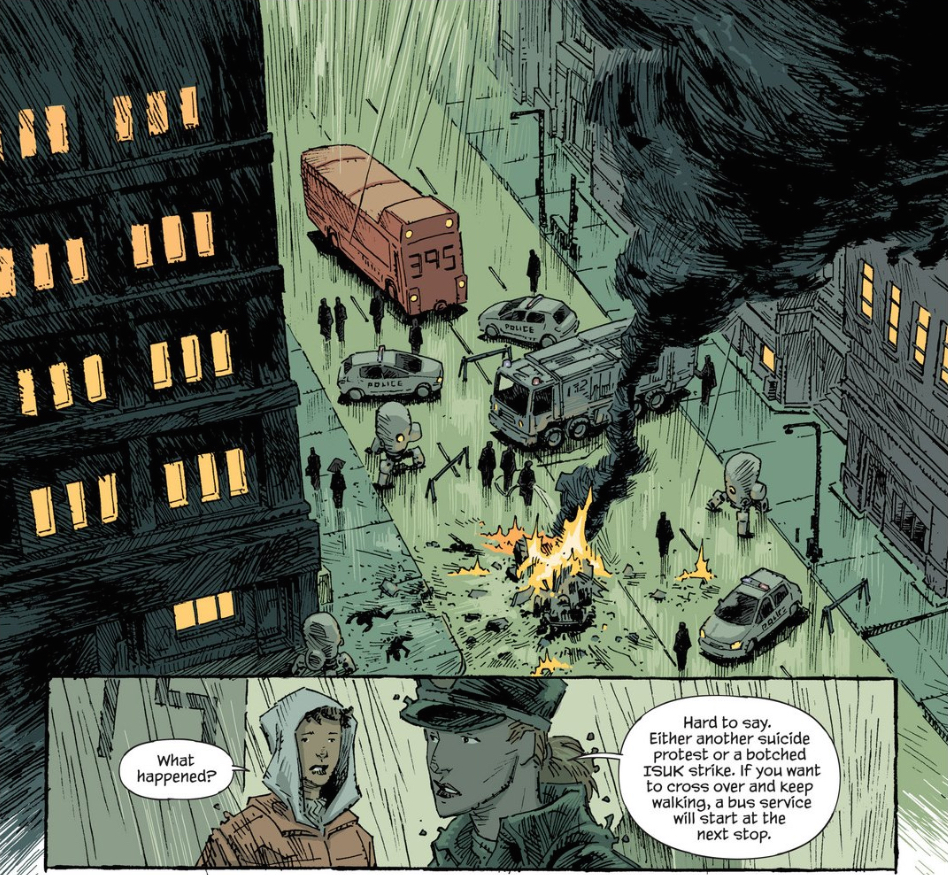 I confess to not paying the ubiquitous presence of drones enough attention until they destroyed the bloom of the young artist Chen last issue, but now it is impossible to miss the large footprint they leave in the world of Trees. Drones face much controversy in our modern day, and many argue that we have yet to see the heyday of them widely-used in military, commercial, or philanthropic areas. While this may be Ellis taking the next logical step in this technology’s advancement in this slightly futuristic world, it could also be a commentary on how governments respond to a threat as opaque as the Trees, and whether or not this trust in the mechanical could be yet another part of our Downfall.