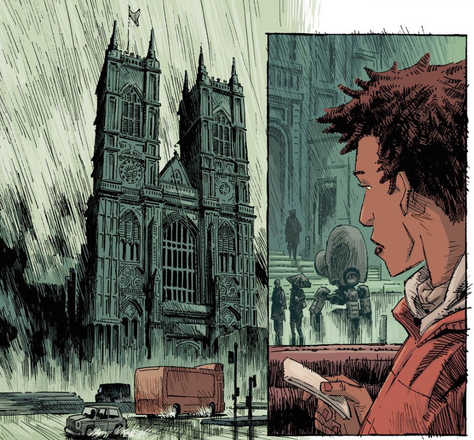 As you may have gleaned from the absence of so many plot threads, Trees 9 is just as much about what Warren Ellis and Jason Howard show us as it is about what we do not see. One image that speaks volumes is that of the drone at Westminster Abbey:
