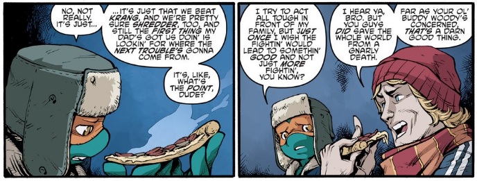 Donnie isn’t the only turtle who’s feeling out of sorts. When Michelangelo goes to to get some pizza from his friend Woody, he divulges that he’s not OK with having to constantly fight crime for a living.