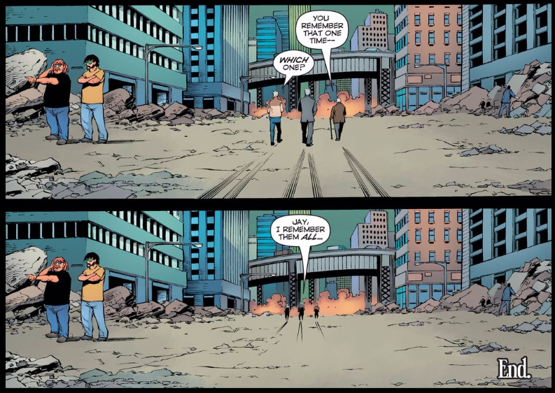 After the battle, Jay, Alan, Carter, and Kent lose their youth and their superpowers. They’re old men at the end of their lives, but they’re content. They got to experience what comic book fans have always wanted, to be a super hero, and they’re grateful for it. Again, being a super hero is awesome, and they know it’s awesome.