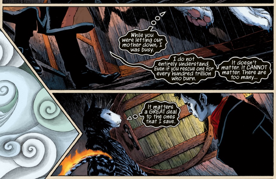 William Faulkner said that “In writing, you must kill all your darlings.” As a writer, you often have to let some ideas go; they can’t all make the final draft. As Drew noted, a lot of The Sandman Overtures is about the nature of storytelling. At the end of the issue, Dream cat presents his Ark of thousands of refugees that he has rescued from the Dreaming. As the protagonist of a story, Dream argues that even if you rescue one life there are trillions more who will die. As a facet of Neil Gaiman, Dream argues that despite all of the ideas he may come up with he can’t ever use them all. Dream cat, either as a saver of lives or a salvager of ideas, counters that any life/idea preserved is worth the struggle. As a creator, Gaiman is saying that anything that makes it to the page is an achievement — no matter what. In the more black and white terms of superheroes the message is any life saved is worth fighting the bad guy. More still, on a more personal level you could say that any personal hurdles one attempts to overcome are worth it for the simple fact that they tried. Neil Gaiman loves talking about ideas guys — and I love talking about his idea talk.