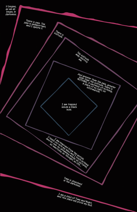 As the issue opens, Dream is facing the fate the stars had sentenced him to: permanent entombment in a black hole. Only, we quickly learn that this was by Dream’s design — he needed to plunge into a black hole to visit his mother, Night. Whether she is obliged to live in that complete blackness, or just chooses to to be beyond the reach of Time isn’t clear, but she’s just as disinterested in helping Dream as his father was. That connection between Time and Night is an important one, and artist J.H. Williams III takes extra care to make it as explicit as possible.
