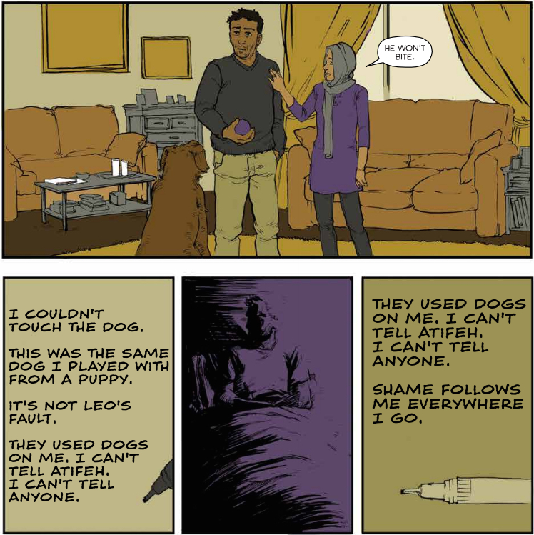 When we move into the protester’s story, the coloring starts to be more stylized, where dark blues and browns are punctuated by bold streaks of yellow. Sometimes that yellow appears arbitrarily, emphasizing something of the storytellers’ choosing, rather than actually trying to convey what color an object or person actually is. Favoring style over literalism even further is the last of the quartet: the Guantanamo prisoner’s story is largely told in alien purples.