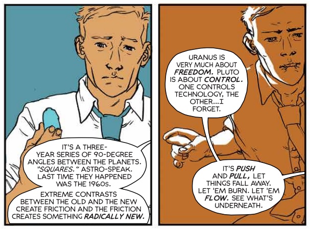 Oddly, the only characters trying to make sense of this order are our filmmakers. The actress Nylon Dahlias and the director Sailor Rossenfield have an interesting, if seemingly pointless, conversation about about the Uranus-Pluto Square. I’ll let Nylon describe it.
