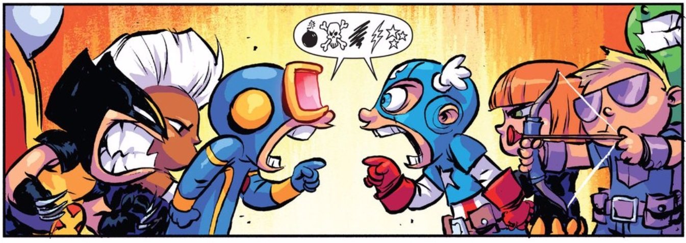 Still, I was surprised at how well the plot works too. An escalating series of petty pranks and competitions continually drives the rivalry between the Avengers and the X-Men — it’s simple, but incredibly effective at escalating the conflict to greater and greater heights throughout the issue. It feels like Little Rascals meets Ed, Edd and Eddy meets Lil’ Gotham, and it couldn’t be more delightful.