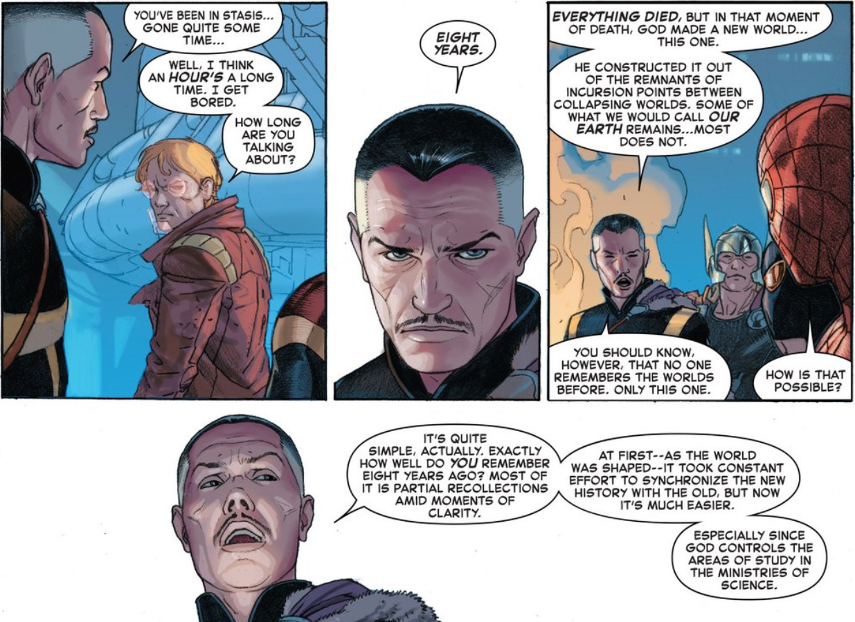 Drew: There’s nothing like comics continuity — and I mean that quite literally. Virtually no other narratives feature the same kinds of questions about whether something happened, how so and so exists if that didn’t happen, whether or not characters remember events that did happen before they didn’t, or if all of the events we’re reading will somehow be undone in the future. I’ve never been particularly interested in what is and isn’t canon (as far as I’m concerned, the only stories that “count” in comics are the ones that I’ve read), but it’s certainly interesting to see how the Big Two twist themselves up in knots to explain things. Marvel has long touted its continuity as being unbroken (a few retcons notwithstanding), in contrast to DC’s system of periodically “resetting” their universe with a massive crisis, but Secret Wars began with proudly proclaiming the death of the Marvel Universe as we know it. Indeed, this week finds writers not just defending that break, but reveling in it.