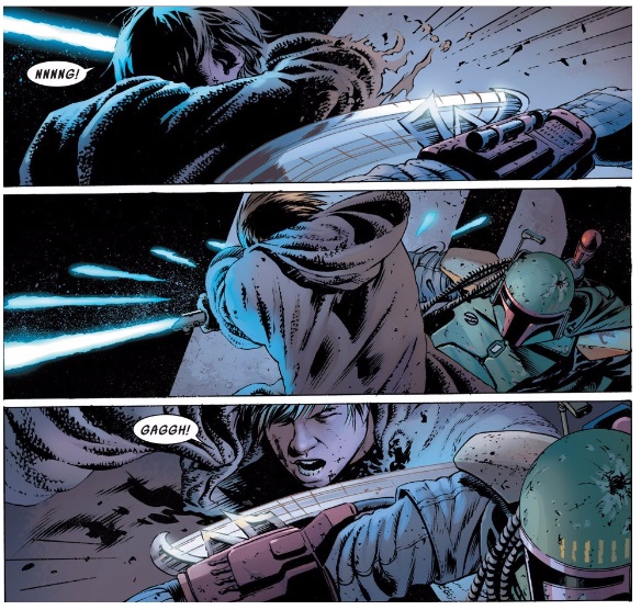 Patrick: I am 100% certain that the point I’m about to make is going to be misunderstood: this issue of Star Wars is all about space. WAIT! You thought I meant outer space, didn’t you? IT’S OKAY TO ADMIT IT. I mean that the bulk of this issue is intensely interested in the physical space between characters, and how they either have to overcome that proximity or use it to their advantage. The big centerpiece here is the knock-down, drag-out brawl between Luke and Boba Fett in Obi-Wan’s home on Tatooine. It’s the epitome of close-quarters combat and artist John Cassaday drops the camera into every imaginable corner of the room to give the reader a complete view of the action. And that action is tight. Luke and Boba Fett are close enough that the blades on Fett’s gauntlets pose just as much of a physical threat as Luke’s lightsaber.