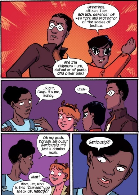 Even in the most stoic and serious minded comic, superhero costumes run the fine line between cool and completely ludicrous. Here, North and Henderson highlight how so-called disguises do little to mask the identity of the wearer both with words and design. While poking fun at superhero costumes isn’t new (see: underwear on the outside), I simply love how Nancy cuts through the bullshit of it all with a bluntness that would impress even Hippo the Hippo. Making the scene more funny is how Doreen tries to play off being called by her real name even though she doesn’t even bother to cover her face with so little as a domino mask. I love this self-effacing humor as it reminds me how when I read comics, there are some things I have to accept. Sure, superpowers are part of that, but goofy costumes are also part of the deal as well.
