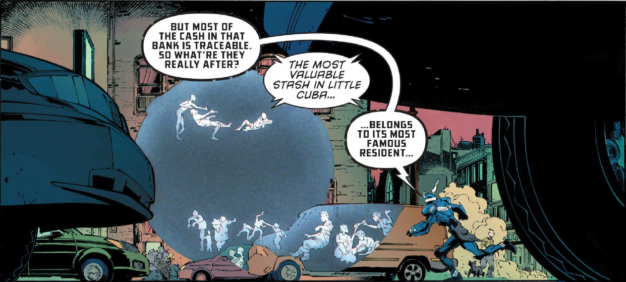 Batman 41 introduces us to the new status quo of Gotham City with Gordon’s first day on the job as the “Robobat-bunny.” We see Gordon’s “origin story” as well as the introduction of the new regular cast of characters for the series. Alfred’s daughter Julia is one of the “Bat techies” in Gordon’s ear that helps him take down an energy monster that is running amuck in Gotham’s “Little Cuba.” With his average joe gumshoe knowledge, Gordon deduces that it’s all a distraction from the robbery that is taking place in a baseball veteran’s home.