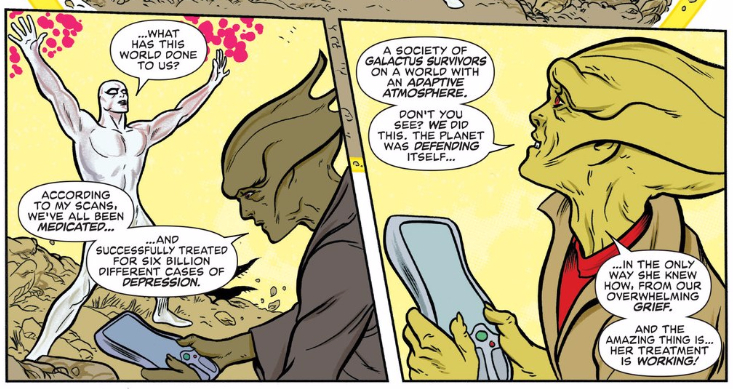I love that Euphoria takes the form of characters from Founder Keen, Norrin and Dawn’s pasts because the issue starts to make the comparison between fictional characters and real life people. The order of events is as I have it in the previous sentence — first Founder Keen’s lost love (or mother or sister or friend, it’s not clear) tries to put him at ease with this new life. As an audience, we don’t have any context for who she is, but we can read some context clues and know that she was important to Keen. That’s the concept at it’s most abstract. Then we move on to Norrin Radd and Shalla Bal. Shalla’s got a publishing history that goes back to 1968, so longtime fans might be familiar with her. But even if you’re not, Slott and the Allreds are cashing in on the invisible cultural currency of an existing, but largely unknown, character. Drudging up old characters and concepts always gives a new comic (or movie or TV show or whatever) a little bit of street cred. At the very least, it’s a move we understand and come to expect — the mythology is being expanded by looking back into the vast catalogue of source material.