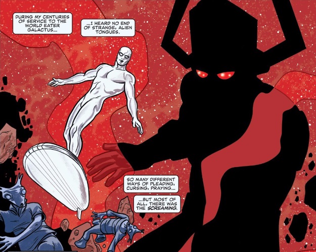 Why would we start our story here? I suppose this dream provides a little bit of an emotional overview of Norrin’s past, but that’s also something the exhaustive recap page accomplishes. I think we need to see the this version of the character in action to be reminded that before he was a our interstellar hero, he was the agent of a cosmic destructive force. Those are the character’s roots — as a villain, albeit a reluctant one. I couldn’t tell you what it was that made people respond to Silver Surfer back when he was introduced — maybe the sleek, sexy design, maybe the surfboard was just the right mix of exotic and relateable, maybe the total mystery surrounding his relationship with Galactus — whatever it was, readers and creators wanted to see more of this guy.