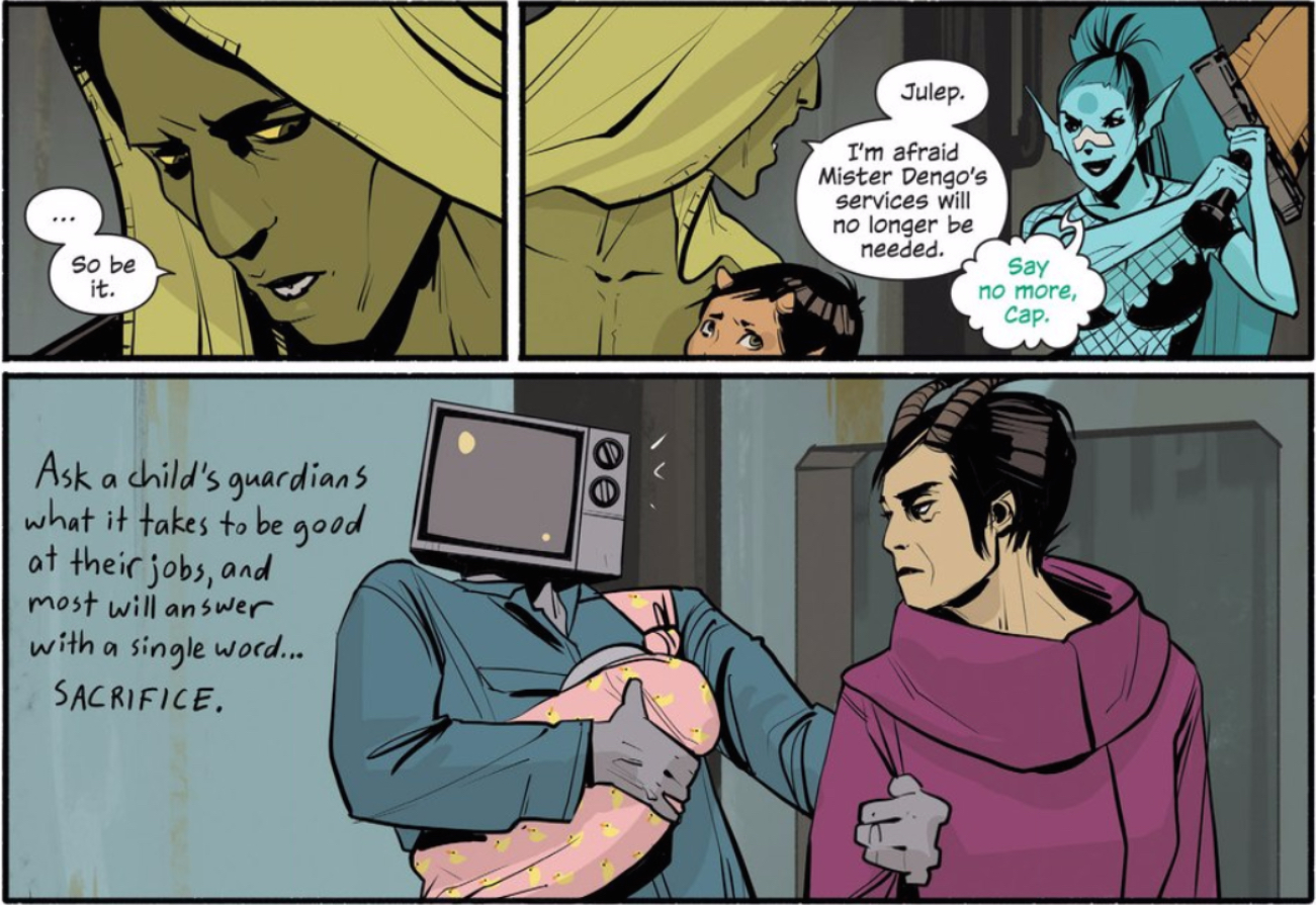 It’s a jarring issue, as those shifting values exact sacrifices from all of our groups, but the most profound value shift might be seen in the Last Revolutionaries. Their plan to trade Hazel in a prisoner exchange of sorts with Wreath High Command takes a turn for the worse when Secretary General Vez realizes Dengo is amongst the Last Revolution’s ranks. Vez lays out their options: kill Dengo or kiss their deal goodbye. Shockingly, the Last Revolutionaries opt for the former.