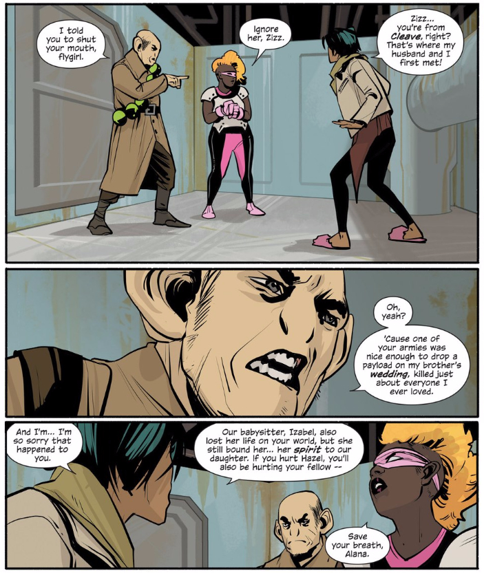 Now these officers certainly have just reason to be wary of Alana, and to hate the various armies that have put them through so much. But Alana and her family are no longer any part of those armies, and Hazel is living proof — in fact, the very reason everybody in the galaxy wants Hazel so badly is because she’s a living example that peace between Wreath and Landfall is possible. If these nations’ fear isn’t enough proof of Hazel’s symbolic power, there’s also Izabel, who, like Zizz here, has every right to hate Alana and Marko, but instead becomes one of their closest allies.