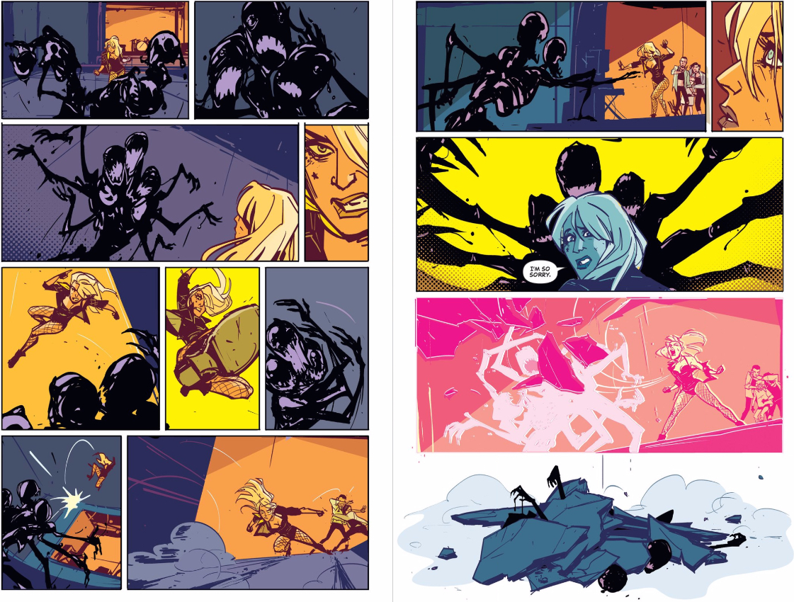 Wu’s has long been a fantastic storyteller, and her immaculate choices are on full display here, but I mostly want to focus on Loughridge’s use of color throughout this sequence. There’s a diegetic explanation for the hot/cold contrast we see throughout the sequence — the stage is well-lit, while the rest of the club is appropriately dim — but it also sets up a simple colorful shorthand between Dinah (always in orange/yellow) and he monsters (always in blue). That mix of color makes the page pop, but I’m most impressed with the third panel on the second page here, where Loughridge breaks that rule, surrounding the monsters in yellow, and coloring Dinah in shades of blue. It’s a subtle way to show how close these characters are in space, and makes for one hell of an image.