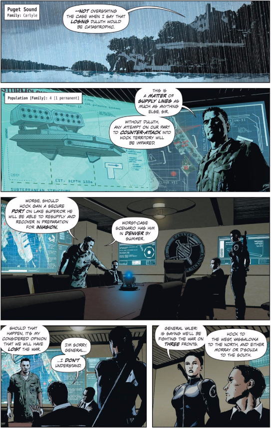 The storytelling is so fantastic here, I can’t help but go through it panel by panel. We open with a straightforward establishing shot — Lark lets the weather establish some of the mood here, but it’s largely boilerplate. Next, we open on a medium shot of the general, getting a clear sense of his station, as well as what this meeting is all about. Lark then pulls the camera wide to establish who else is in the room, and their relationships to one another. The general is standing because he’s giving a presentation, but Forever is presumably doing so because of her station. She’s not an equal member of this meeting, but the fact that she’s standing betrays a common ground of discipline and military strategy that she shares with the general. Just as important, though, is who isn’t in the scene — Malcolm’s seat at the head of the table is conspicuously left empty, a detail that becomes increasingly important (and apparent as the scene wears on).