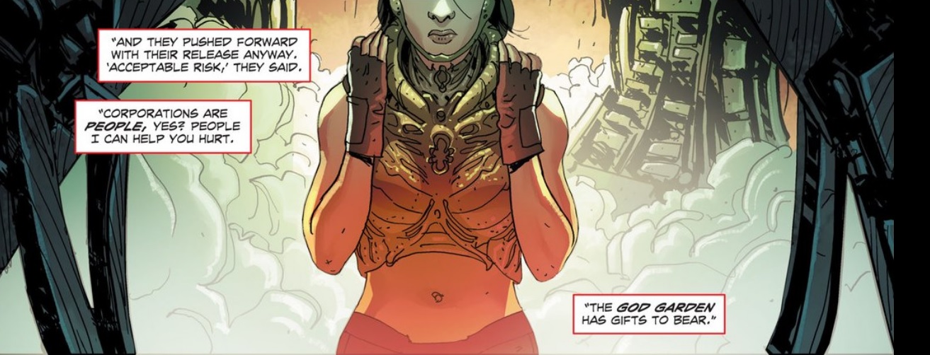 Writer Steve Orlando is taking the opportunity to write about corporate bullshit – ironically from a totally corporate sounding board. As I am prone to reminding in my write-ups, regardless of stupendous storytelling, our favorite superheroes are corporate mascots. If real corporations are people and fictitious superheroes are gods then we might as take it a step further and say that corporations are gods themselves. With the sprawling amount of data, power and influence major corporations have on the American people it’s hard not to think of them as omnipotent and omnipresent.