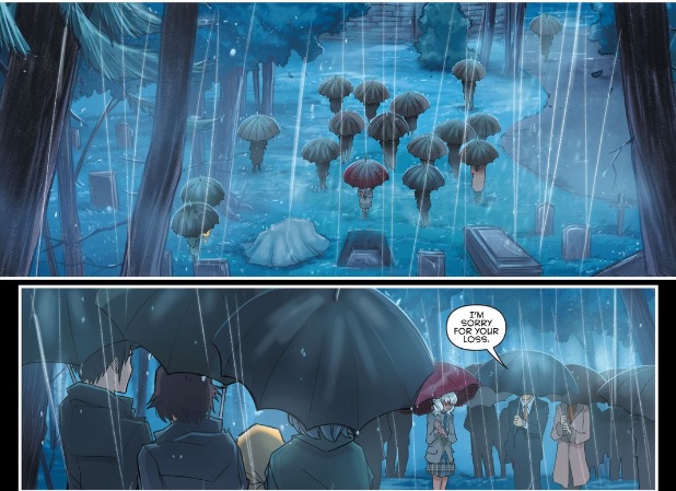 Anyway Drew, I very much agree with your assessment that the issue keeps its distance from Olive, but that distance is purposely meant to put us in the shoes of Kyle, who finds himself emotionally further away than ever from the girl he loves. Artist Karl Kerschl and colorists Serge Lapointe & Michele Assarasakorn manage to perfectly convey the distance and isolation these two characters feel through the art.