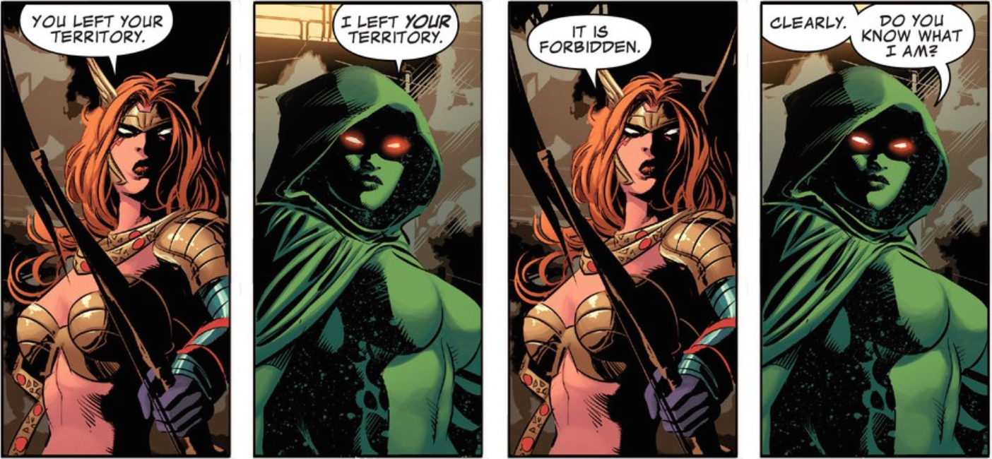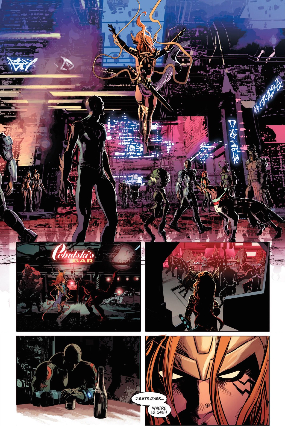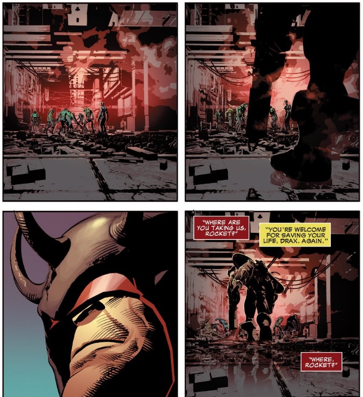 A perfect example of this comes after Angela and Destroyer get into over the whereabouts of Gramora. They battle for a bit and eventually Rocket saves Destroyer leaving Angela frustrated. After the scene the panels cut away to a mysterious figure observing the action from the shadows.