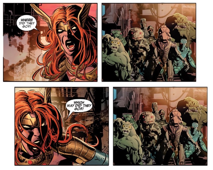 Okay, so a couple things here are funny to me. First, you’ll notice the same use of a repeated panel here as you mentioned earlier Drew. Here, however, instead of being a detraction from the issue, I think it adds a hilarious note. This crowd of aliens, stunned at seeing an incredible fight have no answer for Angela. They just saw two heroes kick the shit out of each other and then one of them vanish. What are they supposed to say? Also they are all rightfully terrified of Angela, almost afraid to move. In this case, the repetition of panels 2 and 4 create a wonderful gag and instead of seeming like a short-cut, they seem like a wonderfully funny aspect of the issue.