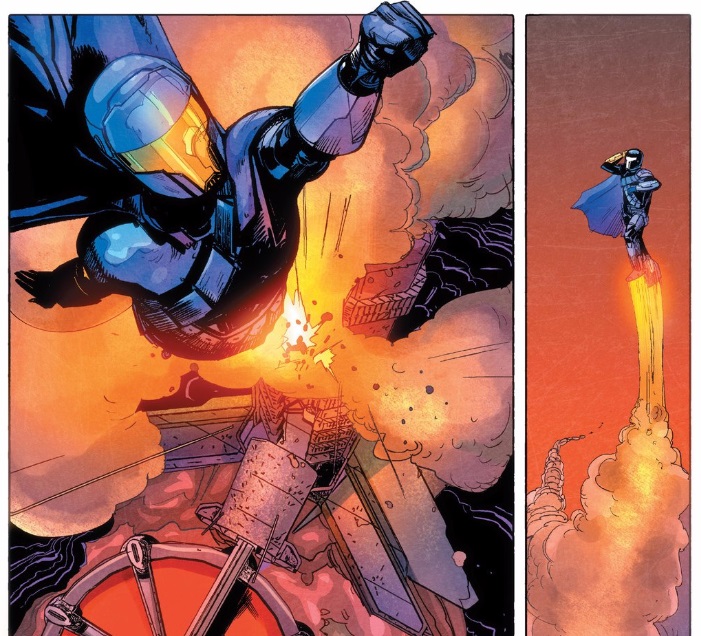 The entire heist takes place under the shade of blue, and only once they have their prize do they make a physical transition with the ship from the blue area of the panel to the red, thus signifying their change in status. This also ties it into the story beat most prevalent to the second issue, the escape with the goods. Seeing as the escape from this heist is the bulk of the second issue, the relationship suggested by this color scheme only get more potent.
