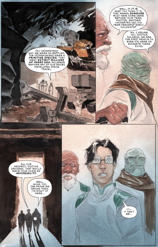Spencer: In the letters column of Descender 6, “Mail-Bot” mentions how amazing it is that artist Dustin Nguyen can draw and paint an entire issue of Descender every month, but that in order to keep a monthly schedule, the title will be taking a two-month break between each storyline. Those two months are certainly deserved, because Nguyen’s work has been absolutely breathtaking. What stood out to me the most about his art in Descender 6 is the way Nguyen uses color and texture to differentiate locations.