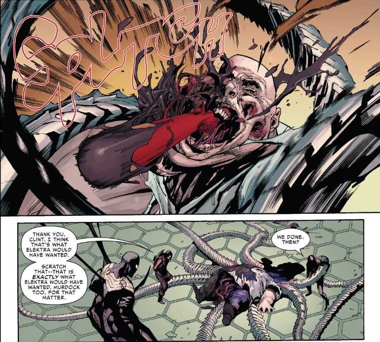 That ends up being the tone that pervades the whole issue. Elsa pulls off some cool stunts rescuing the child (who we find out is a girl!), but all of those skills are resultant from a lifetime of neglect and abuse from her father. When presented with an opportunity to make the little girl make the hard choice to blow up Deadpool and end his suffering, Elsa starts to transfer that some cruelty onto her new ward, but ultimately makes the more compassionate choice and does the dirty work herself. I trust we’ll get into this in greater detail next month — especially as Elsa comes face to face with Dead Daddy Bloodstone by the end of this one — but Spurrier seems to be asserting that Elsa’s experience isn’t worth the skills they produced. The question, of course, will become: is Elsa being cruel to the little girl by sparing her these cruel life lessons?