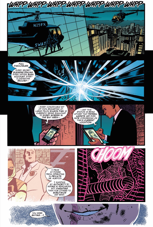 Unlike the montage sequence, which uses the space between panels to imply the passage of several days, these cuts must maintain the momentum of one scene, even though they all feature different subjects from different perspectives. It’s a real trick — especially when those last few are almost explicitly perspectives of characters in the scene — but Samnee pulls it off beautifully, showing us Matt’s plan, right down to its inspiration, without ever pausing to give him the long Sherlock Holmes-ian monologue where he reveals all. That’s not something many artists can pull off, and it’s certainly not something a lot of writers trust their artists to pull off, so it once again speaks to the strength of this collaboration that we have anything like this at all.