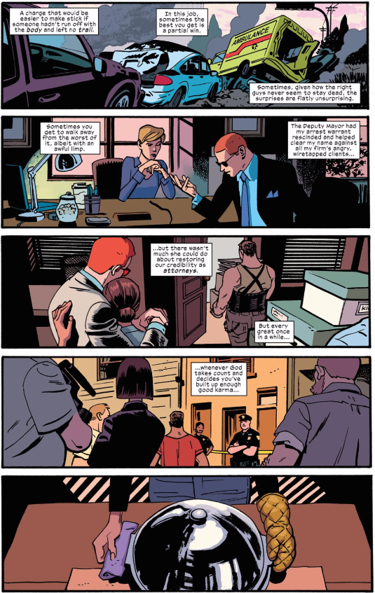 Montage is a common tool used at the end of a series (The Wire immediately springs to mind), efficiently tying up the loose ends that don’t necessarily warrant a whole scene. I’m so used to praising Samnee’s skills at layouts that the cleverness of this sequence almost passed me by. Each image is of a totally different place and time, yet each scene tells a meaningful story in itself — that’s some real storytelling right there. The key is Waid’s copy, revealing the true strength of this collaboration, which ties these moments together into a meaningful story. Moreover, letterer Joe Caramagna’s placement works with Samnee’s compositions to slowly direct our eyes closer to the center as you work down the page, adding some impact to that final, textless panel.