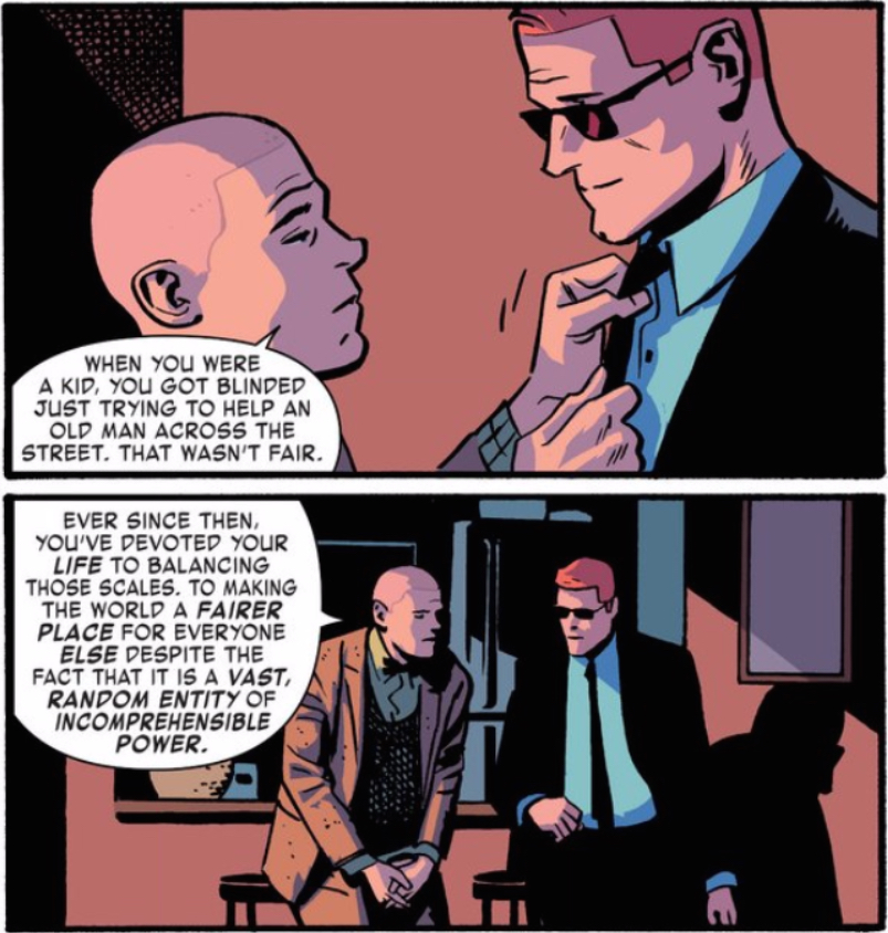 This also addresses a question that’s been in the air since Waid’s very first issue on Daredevil — can a happy Daredevil truly stick? Can Matt Murdock embrace the light and actually stay in it? It’s always been dubious — Matt was clearly trying to “fake it till he made it” at first, and he’s been through plenty of rough patches and depressive episodes since then — but it looks like we’ve finally got a definitive answer. I appreciate how Waid emphasizes that the path to happiness isn’t without its bumps along the way — even in our “happy” ending the Owl and Jubula escape, Ikari may not be dead after all, and Matt and Kirsten’s law firm may be defunct — but also shows that Matt now has the tools to persevere even under the toughest of circumstances. He’s no longer faking his happiness — he’s no longer afraid of the light — he instead now has the self-awareness he needs to embrace the happiness that was once little more than a foreign concept to him.