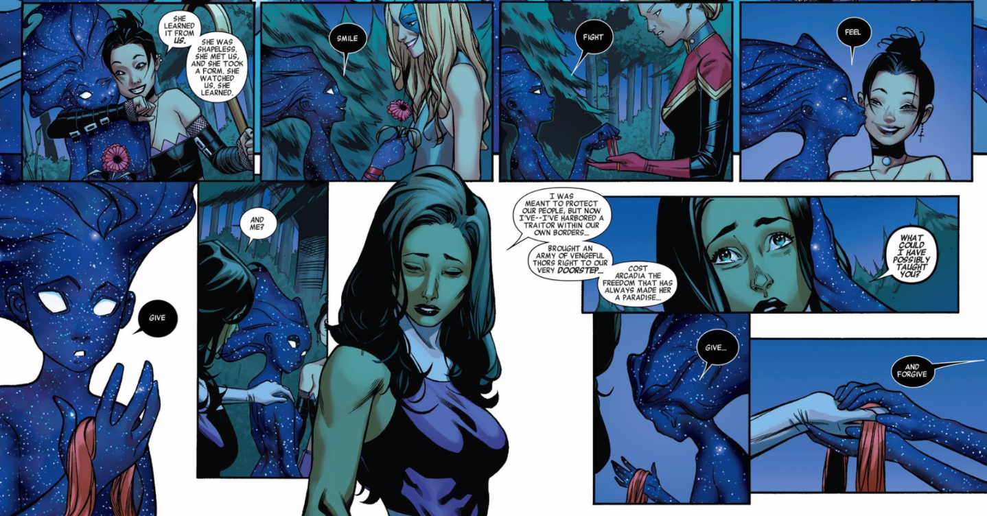 Maybe I’m just a sucker for the lesson that we can all learn something from superheroes, but it doesn’t bother me at all that this message is coming for the living embodiment of the entire universe. What does bother me is that this message isn’t quite earned within the series. I don’t doubt that someone could learn the value of smiling from Dazzler, or the value of fighting from Captain Marvel, I just don’t feel like I saw this character actively learn those things from those characters. Maybe that kind of interaction is too much to ask of a five-issue mini (its continuation beyond Secret Wars notwithstanding), but without it, this moment doesn’t quite live up to its potential.