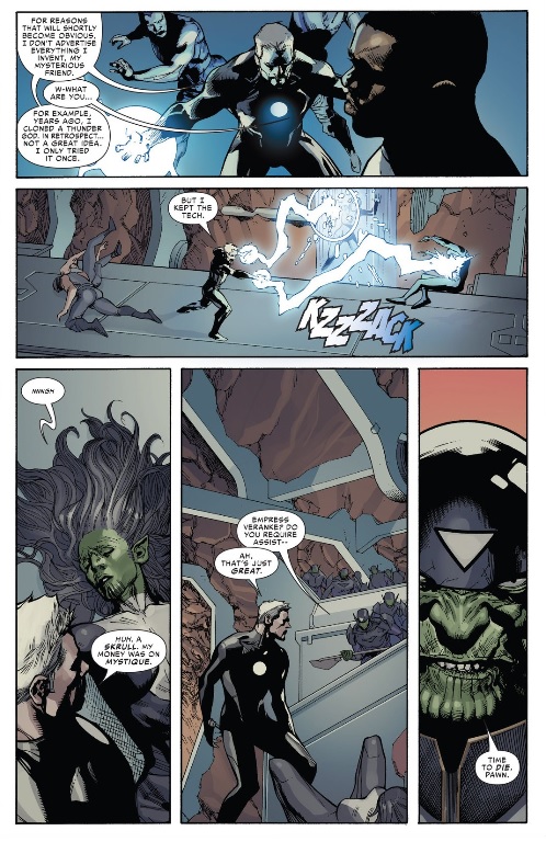 Civil War 4 pulls back the curtain a little more after the reveal last month that Black Panther – who was killed years ago – has been alive and pulling the strings all this time. PSYCHE! T’challa is a Skrull, because, the year is 2008. In all honesty I don’t hate this reveal behind “the reveal” – it sort of makes sense with the stage that Soule has set. It also makes me think of the principle that many pieces of popular fiction bring up: the constant nature of a certain event in every universe. In Lost terms, this means that Charlie Pace will always end up dying – same with the old guy in Groundhog Day. In the Marvel Universe, Secret Invasion will ALWAYS happen eventually. Temporal factors aside, the Skrulls were always planning on invading Earth, so it’s no surprise that they are the big bad of Civil War. The Skrulls master plan itself is just a delayed derivative of the original plan – by instead relying on the majority of the heroes taking each other out and conquering the Earth when the dust settles. I suppose it’s safe to assume that the Skrulls have infiltrated Cap’s ranks as well; after all, furthering Beast’s depowering “Project Bellcurve” would be a big victory for the shapeshifters. I think that Soule has done a good job of reaping the nostalgia of the original Civil War without exploiting it. Little winks and nods to the original are always appreciated by yours truly – the highlight of this issue was Tony Stark’s weaponizing of clone Thor’s lightning. Perhaps this is Soule’s intention, but the majority of the book feels like something we’ve seen before. We have Cap and Stark –the fearless leaders in this war – both going full-on Captain Kirk by relegating their leadership roles to their second in commands and charging headfirst into an uncertain battlefield. Continuing that vibe part of me feels like there should be a nuclear countdown clock just to escalate the stakes that much more (and part of me actually really wants that.)