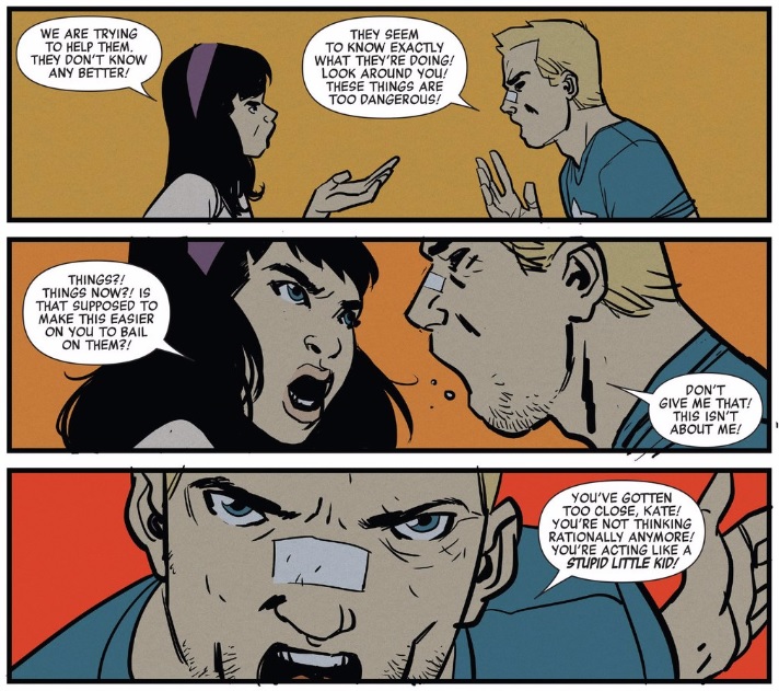 Kate calms the kids down on the next page and makes them promise never to hurt anyone again, and the kids seem to genuinely mean it, but it doesn’t change the fact that Clint and, as much as she’d hate to admit it, even Kate are scared of the kids on some level; they don’t know what these kids could wind up doing in the heat of the moment.