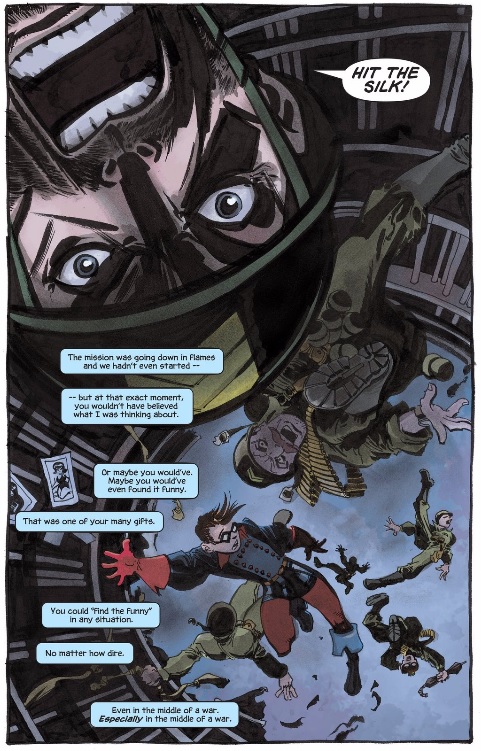Bucky’s death is presented almost like a scene out of a WWI novel. In the midst of relaxing and trying to take their minds off the war an explosion appears out of no where and launches our characters into the surreal horror of war. Sale’s blocking of this loss does a great job of underscoring the randomness and helplessness of his death.