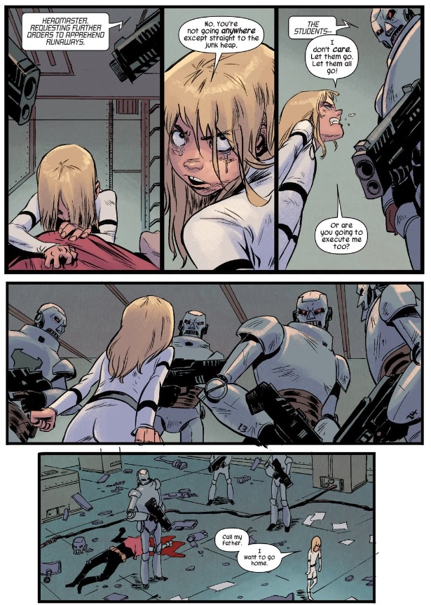 Of course, no victory comes without a price; in this case, it’s Bucky, who sacrifices himself to let the Runaways escape. Neither he nor Valeria can override the Doombots in the midst of such a large-scale rebellion, and Valeria’s favorite comrade ends up paying the price. It — along with Bucky’s final request, “No more killing” — hits her hard.