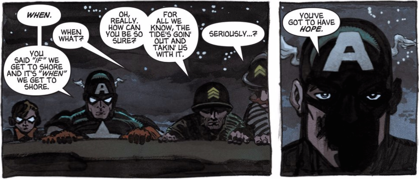 What the fuck good does it do to be cynical in this situation? They have exactly zero options other than to kick for their lives, but Fury wants to remind everyone that they might not make it anyway. I get that Fury’s hardboiled attitude might clash with Cap’s optimism, but “kick or die” really feels like a moment where they might agree on “kick.”