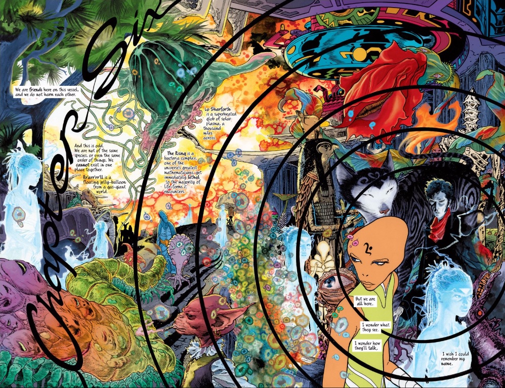 For the record Shelby – I do watch Rick and Morty and your parallel to The Sandman Overture 6 is spot-on. While we wade through the many vast waters of mediocrity, I do think that we as an audience reward fascinating ideas and the brilliant storytellers behind them. I think in a lesser story, the deus ex machina of transplanting a universe (essentially rebooting) would be met with boos, hisses and eye rolls. The thought of “only Neil Gaiman (and probably Grant Morrison) could pull this off” kept ringing in my head as I was reading this issue. It’s an out-of-this-world idea that falls in line perfectly with the framework and structure already established within the world of The Sandman. Dream’s ship is a veritable Noah’s ark, as he shuttles them from the destruction of one universe to a mirror-verse where said destruction never happened. The inhabitants of the ship are the survivors of the “old verse” and the pilgrims of the “new verse” – but more importantly, they are the symbols of Dream’s second chance (technically third chance).